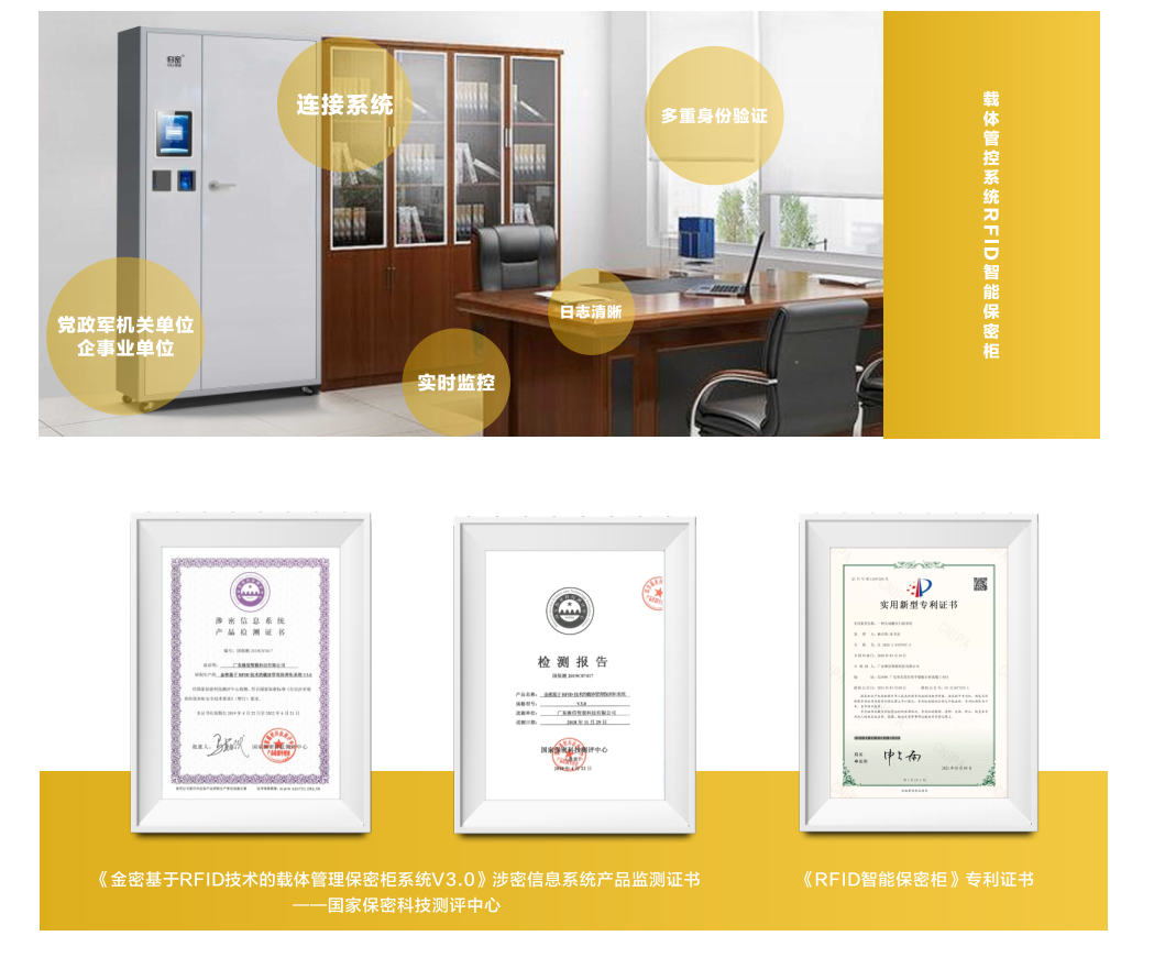 铁石科技自主研发保密文件管理系统以及RFID智能保密柜,获得相关权威机构证书认证,为提升客户单位保密工作效率、确保涉密载体安全提供有力保障。